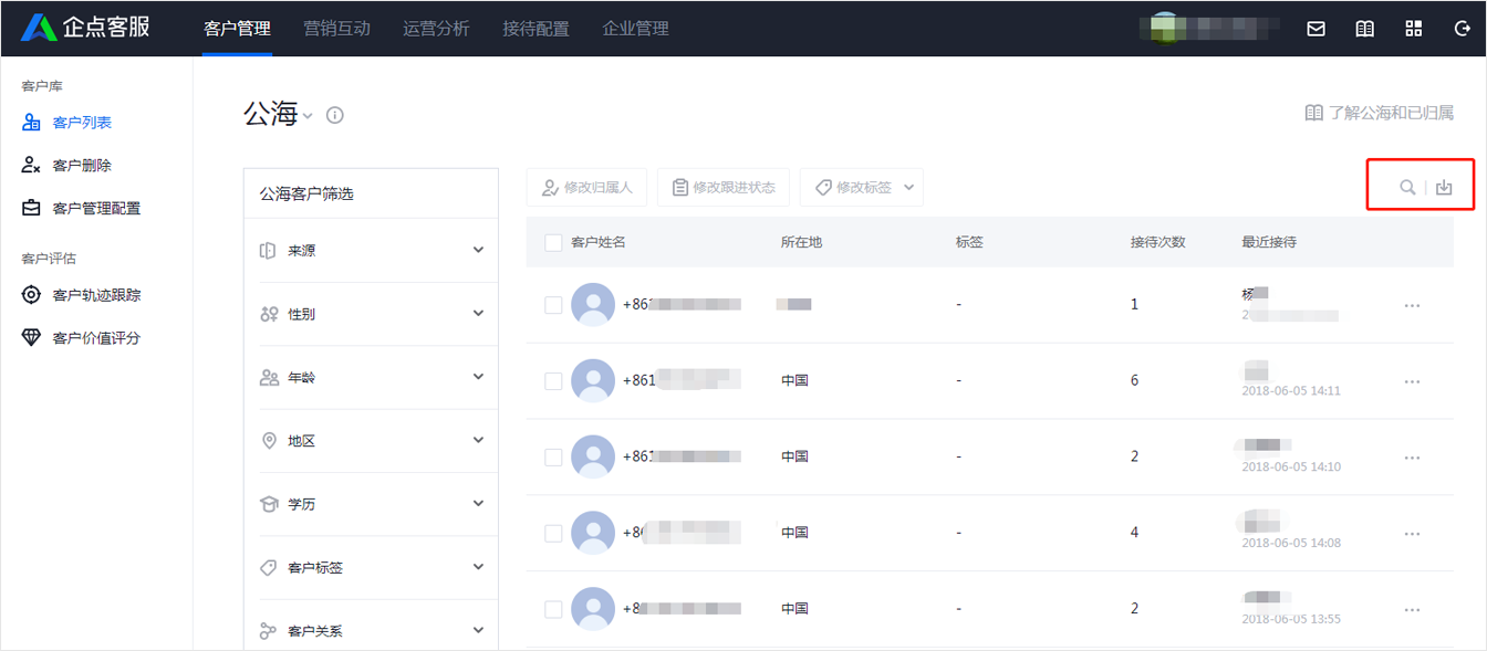 上文我们讲到公海就是未归属给任何坐席的客户的集合,在本页面中可对公海客户进行多维度筛选、精准搜索、查看/编辑资料的操作。