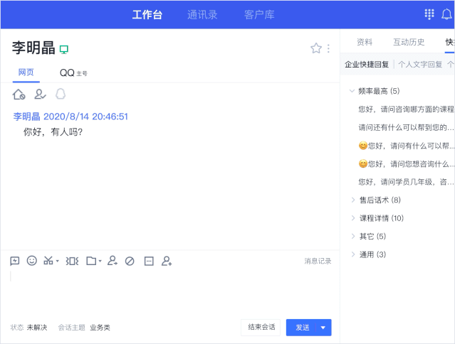 专业的客服团队往往都有一套统一对外沟通的话术,不仅能规范客服人员的会话内容,同时为客户提供更专业的服务体验。3.6版本支持管理员创建统一的企业快捷回复,可用关键字和数字编码,客服人员在工作台输入”#“就能触发快捷编码搜索并调用快捷回复,提升客服回复效率。