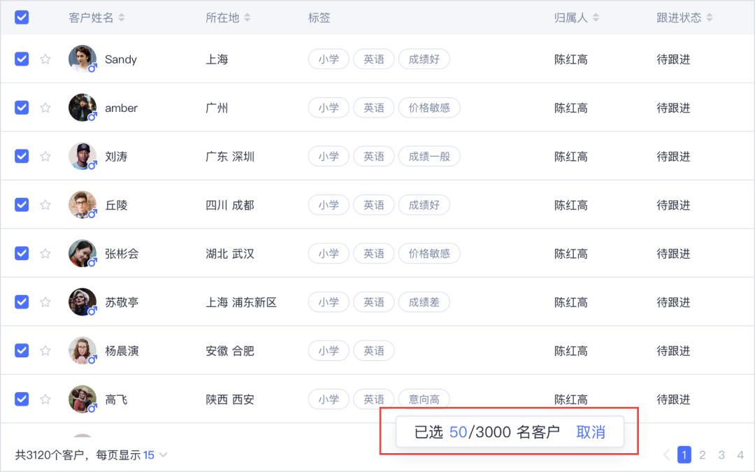 大容量的客户库守护着企业的商机。3.6版本中进一步优化了客户库的操作体验,支持跨页勾选,单次批量操作上线调整为3000,提升客户库操作效率妥妥滴~