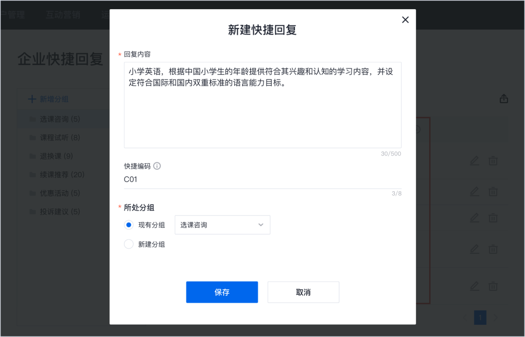 管理员可在账户中心统一开启或关闭企业快捷回复,快捷编码建议使用连续数字或业务关键词 便于客服记忆。
