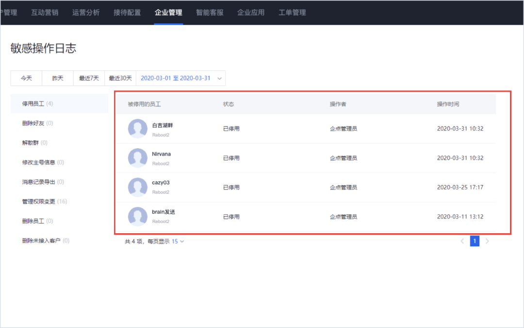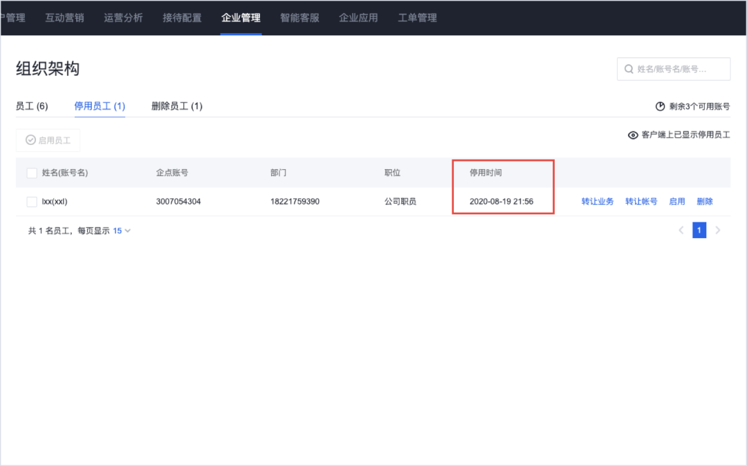 3.企业员工账号被停用重启后,该工号的消息记录会被重新激活,不会被删除。