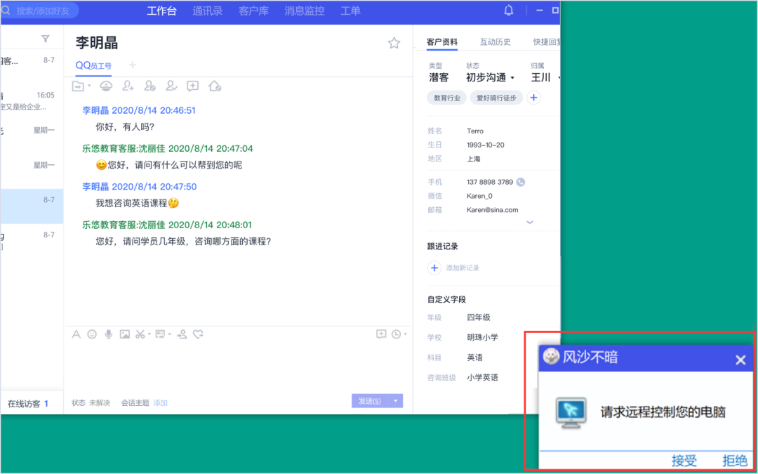 工作台会话沟通中,当客户主动发起音视频及远程协助申请时,无论客服人员在和哪个客户聊天,都能在桌面右下角收到远程协助和音视频的请求,客服人员再也不用担心错过这些邀请啦~