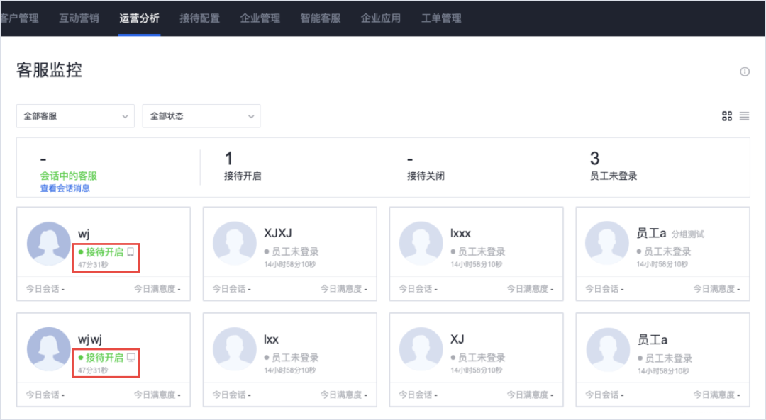 为了给客服管理员提供更全面的监控管理能力,客服监控中新增显示客服在线接待状态,包括PC在线、移动端在线,让客服工作状态一目了然。