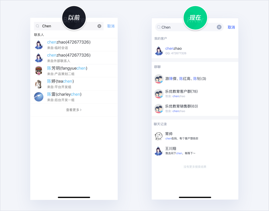 移动端搜索结果支持模块化的分类展示。客服人员可以用客户名、QQ号、聊天记录、部门名等信息快速检索到对应的客户或聊天记录。