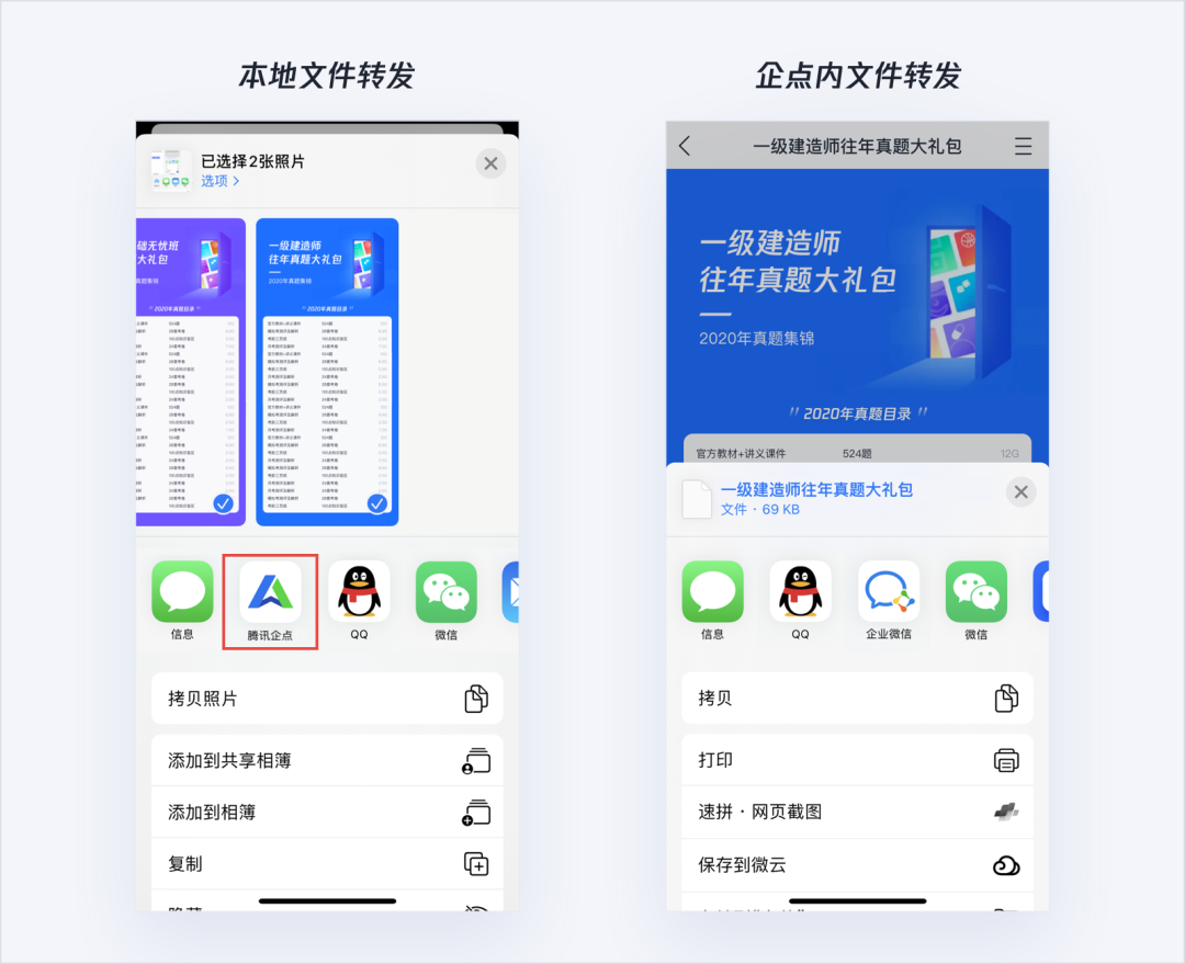 3.6企点移动端打通了与其他常用APP的消息通路,不仅手机本地的图片和文件支持分享到企点,企点内的文件也支持转发至QQ、企微和微信。跨越APP的分享,一起协作呀!