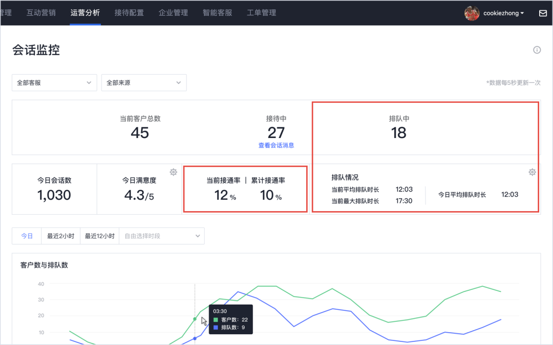 没有一个客户想要排队,也没有一个客服管理员能眼睁睁看着客户排长队而坐视不管。3.6实时会话监控中新增了排队的接通率以及排队时长等指标,让排队情况尽在管理员的掌握之中,更合理地调配客服人员。同时,支持一键导出相关数据报表,为管理员定期复盘客户排队情况提供更多维度的参考。
