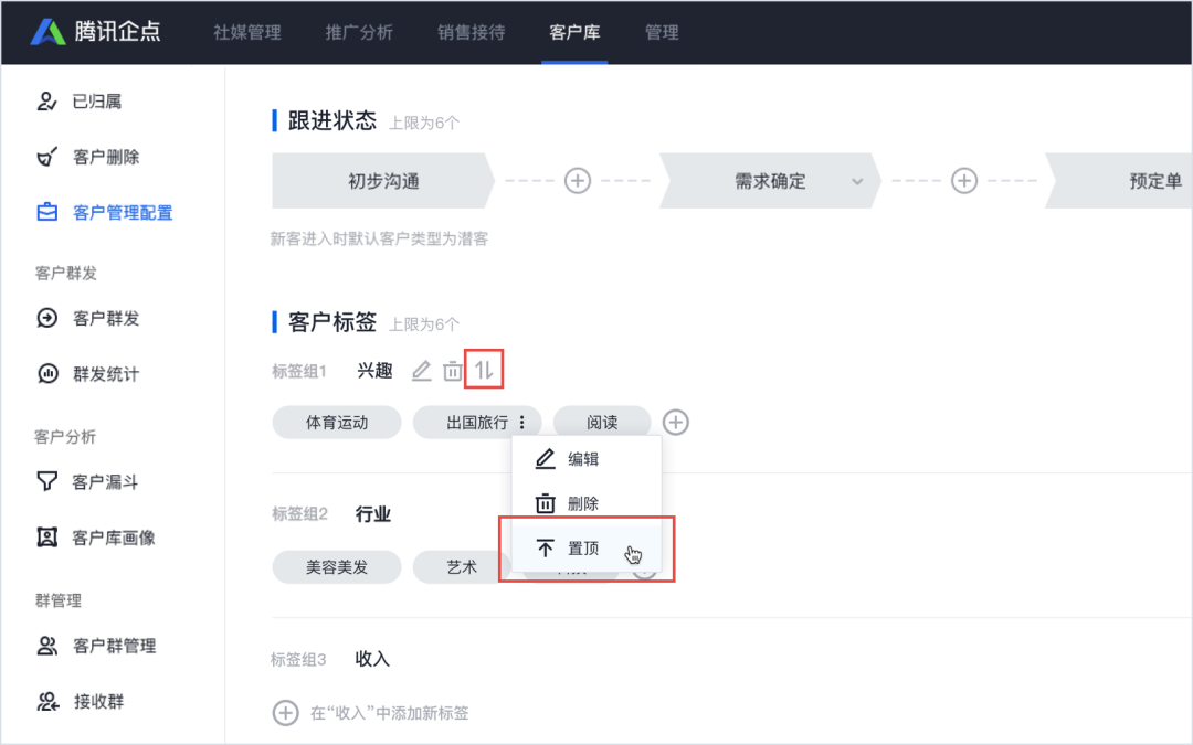 3.6版本中客户标签使用灵活度up up~客户标签组支持按照优先级进行排序,满足多重业务场景下标签组顺序调整的需求,同时组内标签可以置顶,这样在给客户打标签的时候,常用标签就可以第一时间被客服人员看见啦!