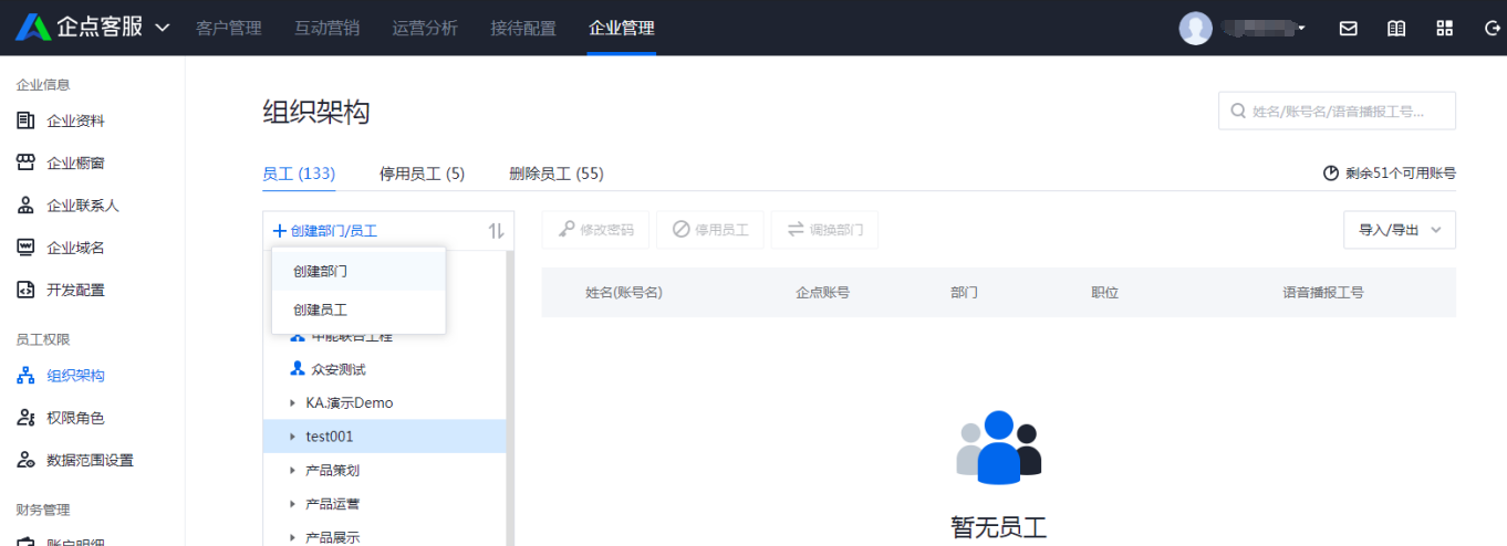 以管理员角色登录账户中心后,在【企业管理】-【员工权限】-【组织架构】中,创建部门和员工。
