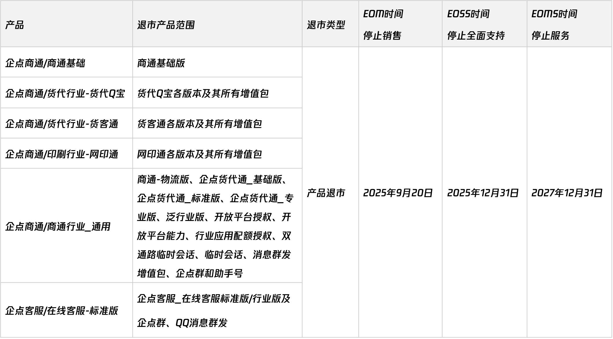因产品策略原因,企点商通和客服部分产品后续将逐步停止提供服务,由此对您造成不便,我们深表歉意。为了避免对您的业务造成影响,请您尽快做好相关业务调整。