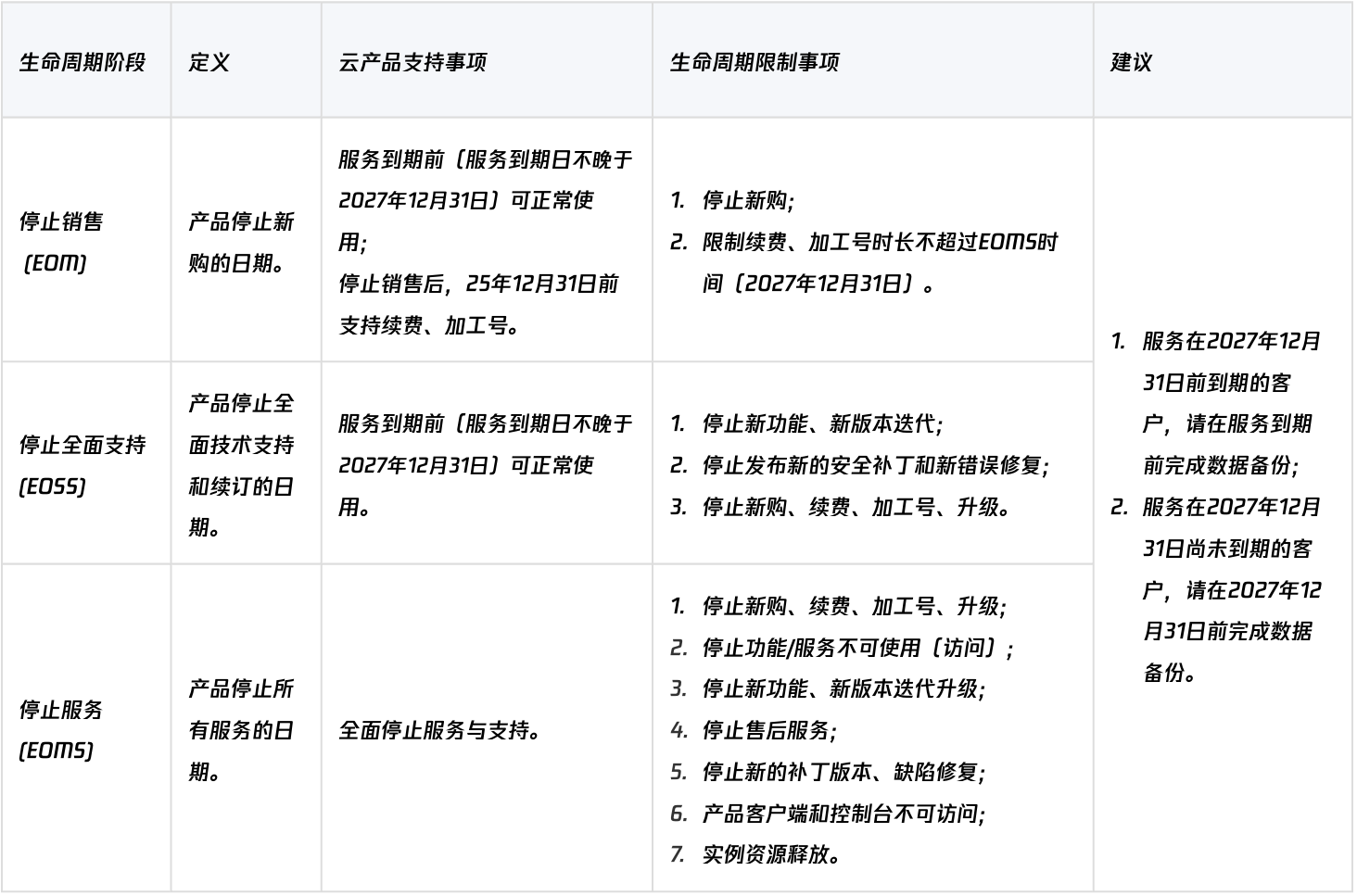 针对产品或功能生命周期阶段的不同,产品在购买、使用和服务支持上存在一些限制。